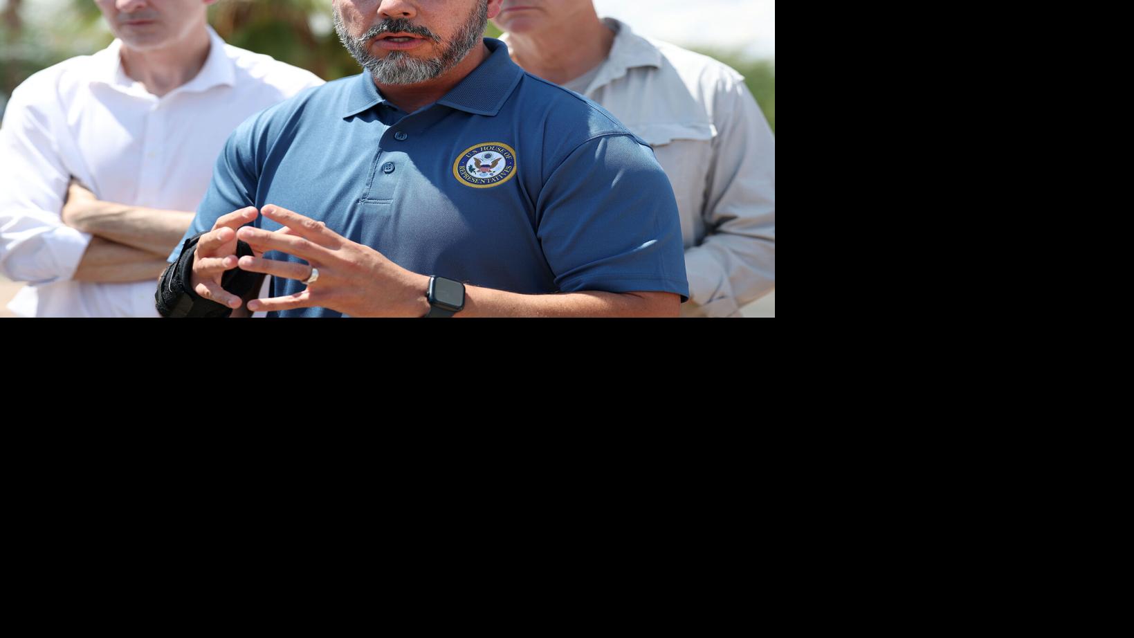 U.S. Rep. Juan Ciscomani, R-AZ, center, speaks to the media alongside a bipartisan group of legislators from the “Problem Solvers Caucus,” as a part of a September 2025 Arizona visit focused on the border, immigration and trade. Rep. Brian Fitzpatrick (R- …